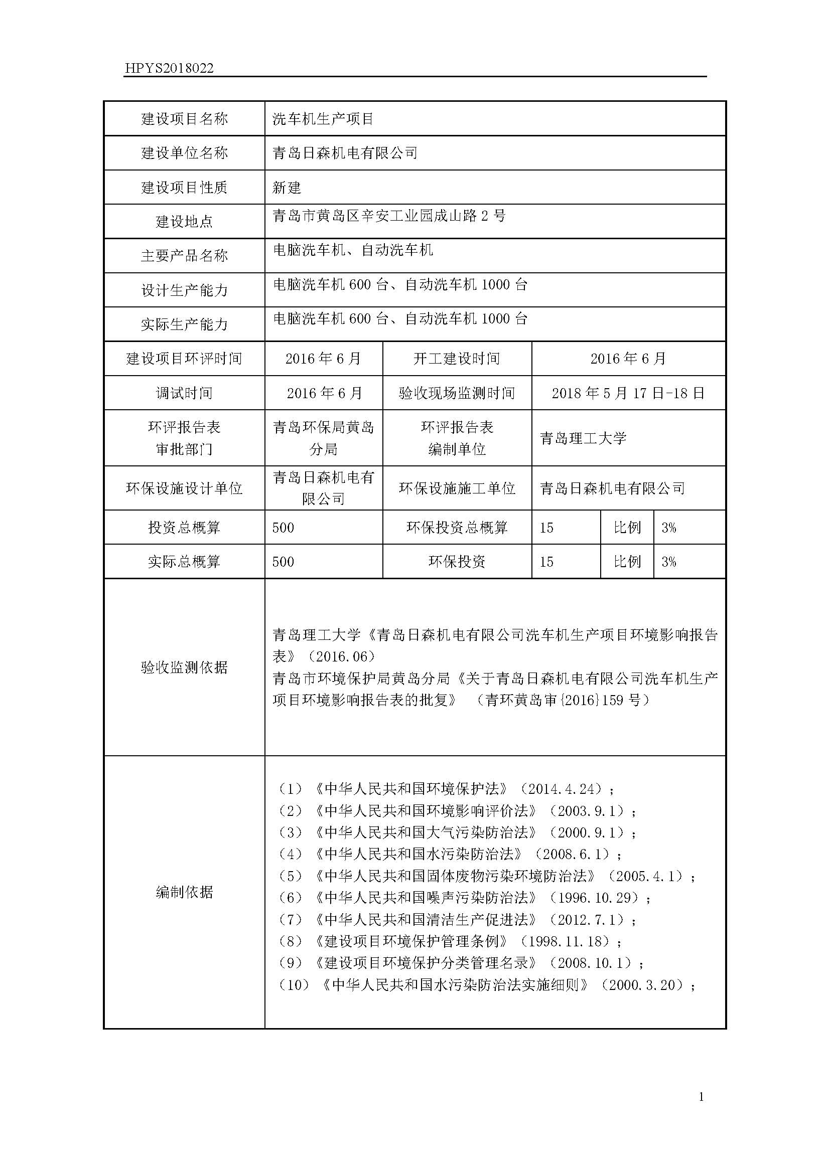 根據《國務院關于修改〈建設項目竣工環境保護管理條例〉的決定》(國務院令第682),以及環保部《關于發布《建設項目竣工環境保護驗收技術指南 污染影響類》的公告》(國環規環評[2018]9),現將青島日森機電有限公司洗車機生產項目環境保護竣工驗收情況公示如下: